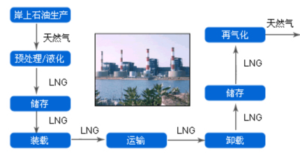 LNG從生產(chǎn)到供給終端用戶是一個完整的系統(tǒng),形成LNG產(chǎn)業(yè)鏈(如下圖所示),包括天然氣預處理、液化、儲存、運輸、接收站、再汽化裝置等。