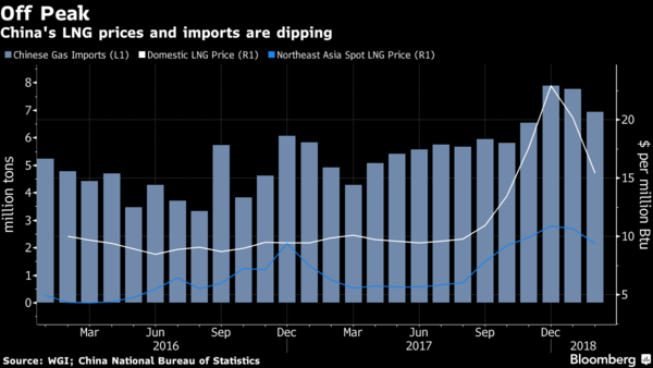 隨著冬季結(jié)束,短缺情況有所緩解,國內(nèi)液化工廠重新啟動(dòng),對進(jìn)口的需求減少。在去年底,中國北方的一個(gè)主要碼頭每天最多裝載400卡車的進(jìn)口液化天然氣。到2月底,這一數(shù)字已降至只有200車。國內(nèi)和全球液化天然氣現(xiàn)貨價(jià)格正在下降。