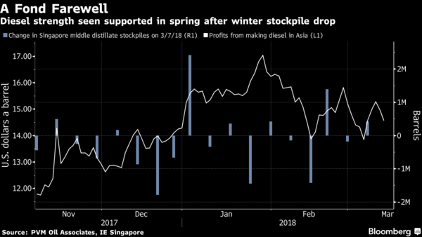 這是因?yàn)?,這些地區(qū)的煉油廠到了每年停產(chǎn)保養(yǎng)的時(shí)候,這會(huì)在需求依然旺盛的時(shí)候維持供應(yīng)緊張。在亞洲石油貿(mào)易中心新加坡,包括柴油在內(nèi)的所謂中間餾分油庫存上個(gè)月降至2013年以來最低水平。